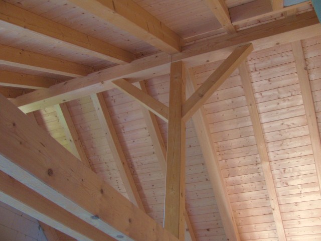 Decke im Obergeschoss Schöne Dachkonstruktion mit Sichtsparren und getäferter, gut isolierter Unterdecke